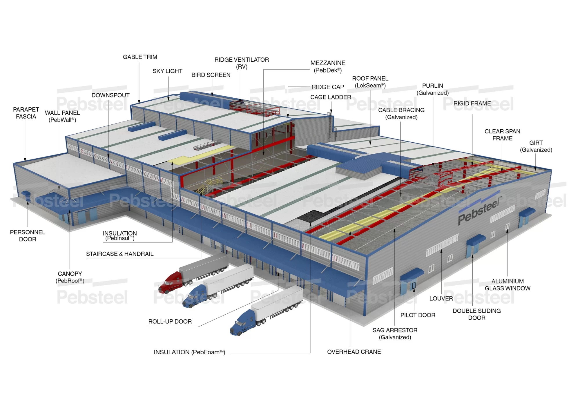 PEB คือ โครงสร้างอาคารเหล็กสำเร็จรูประบบ Pre-Engineered Buildings วัสดุที่ใช้ในระบบ PEB มาจากผู้ผลิตชั้นนำและมีการจัดเตรียมไว้ล่วงหน้า โดยวัสดุทั้งหมดได้รับการรับรองตามมาตรฐาน ASTM และผ่านการควบคุมคุณภาพอย่างเคร่งครัด ความหลากหลายของวัสดุเหล่านี้ช่วยให้สามารถออกแบบโครงสร้างได้ตรงตามความต้องการของผู้ใช้งาน และรองรับการใช้งานในอาคารเกือบทุกประเภท