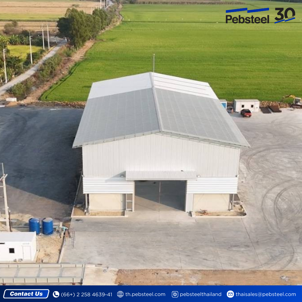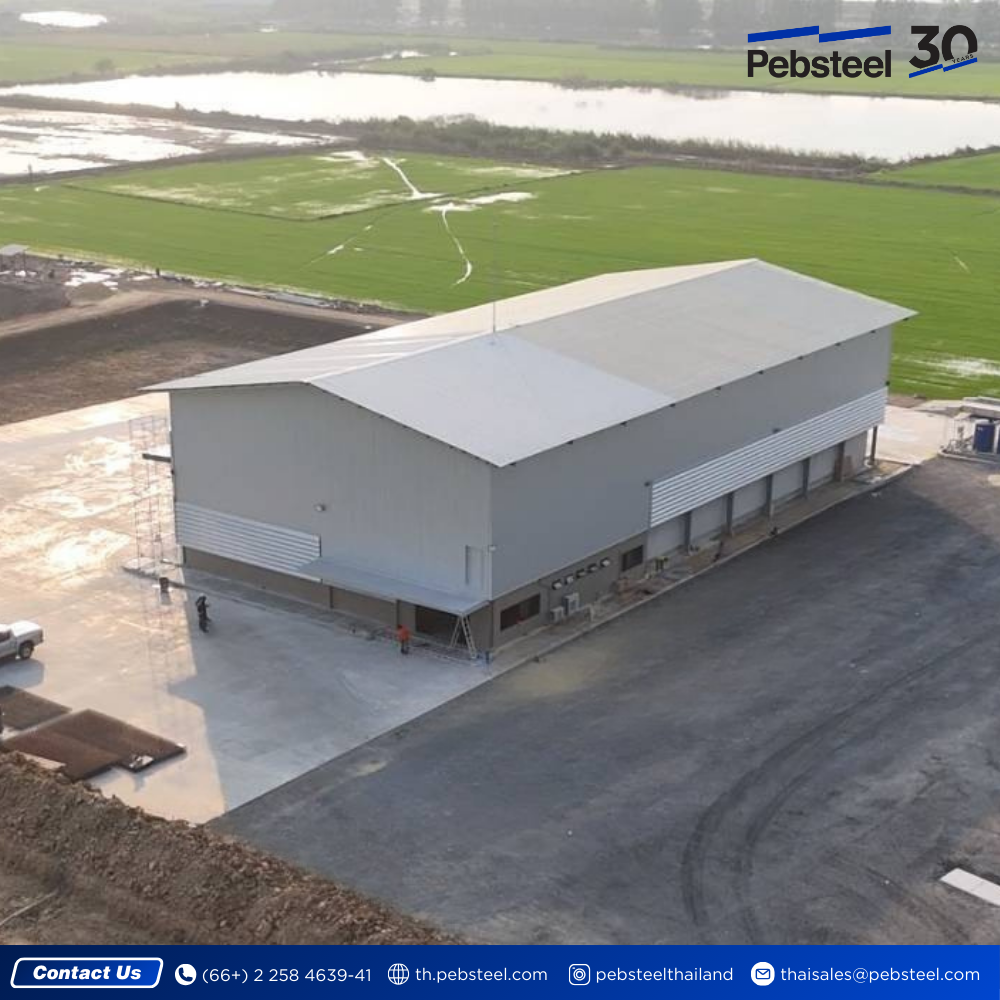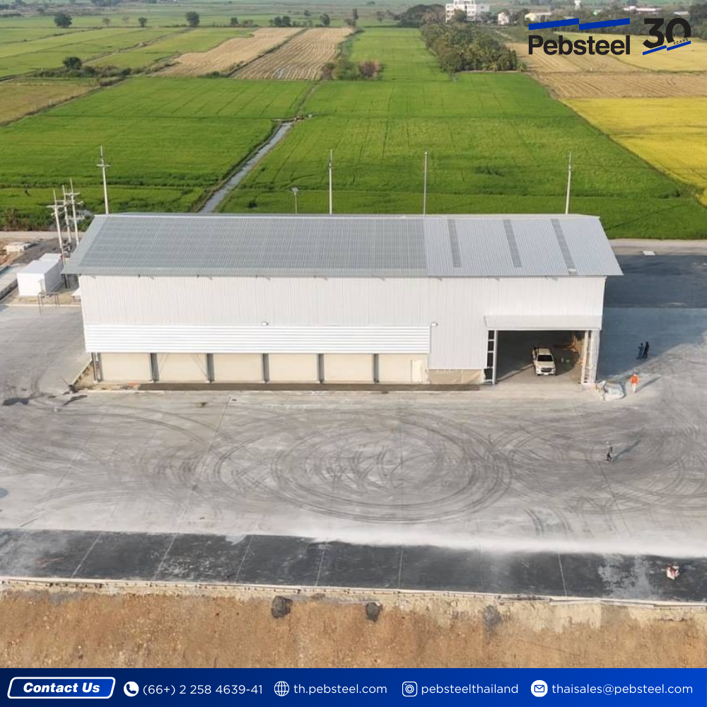 Pebsteel ขอนำเสนออีกหนึ่งผลงานคุณภาพ โครงการอาคารจัดเก็บวัตถุดิบ ที่ออกแบบและก่อสร้างด้วย โครงสร้างอาคารเหล็กสำเร็จรูป ระบบ PEB แข็งแรง ทนทาน และติดตั้งได้อย่างรวดเร็ว ภายใน 14 วันเท่านั้น!